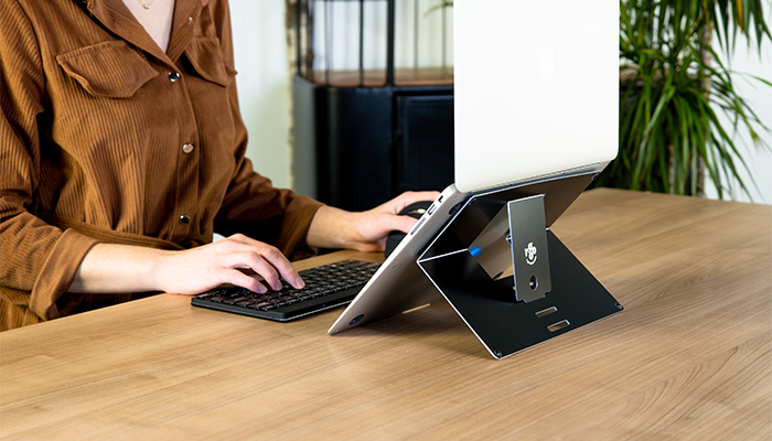 Placez le support à une hauteur telle que l’écran se trouve au niveau des yeux ou légèrement en dessous. Vous adopterez ainsi automatiquement une posture droite. Remarque : utilisez toujours un clavier et une souris séparés pour travailler de manière ergonomique.