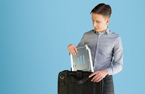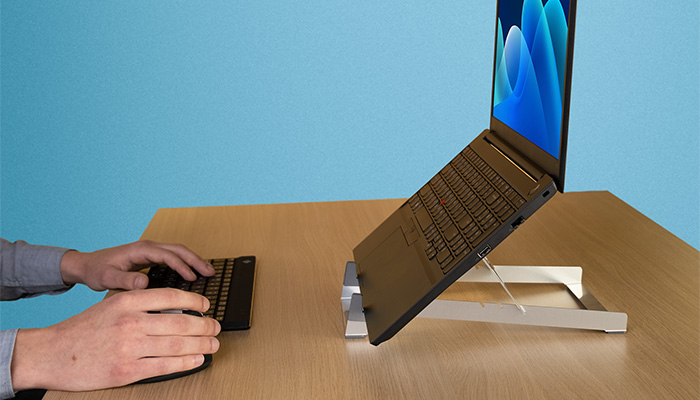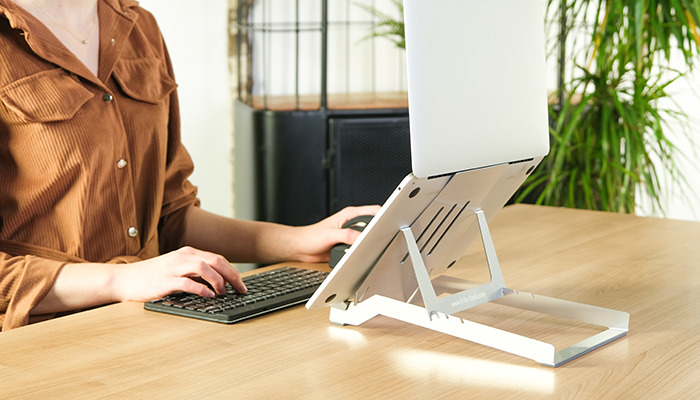 Placez le support à une hauteur telle que l’écran se trouve au niveau des yeux ou légèrement en dessous. Vous adopterez ainsi automatiquement une posture droite. Remarque : utilisez toujours un clavier et une souris séparés pour travailler de manière ergonomique.